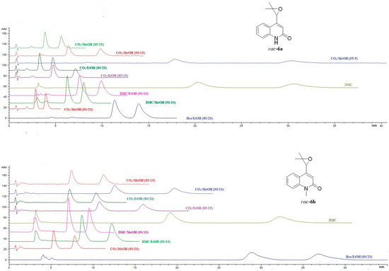 If we compare the enantioselectivity for enantiomers of compounds rac-6a–c on cellulose and amylose columns using SFC chromatography, then the enantiomers of compound rac-6a showed better enantioselectivity on the CHIRAL ART Amylose-SA column. The different chiral recognition mechanism is possibly due to the formation of different shapes and sizes of chiral cavities that build carbamate groups on adjacent glucose units of amylose and cellulose depending on the mobile phase [37].