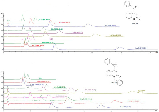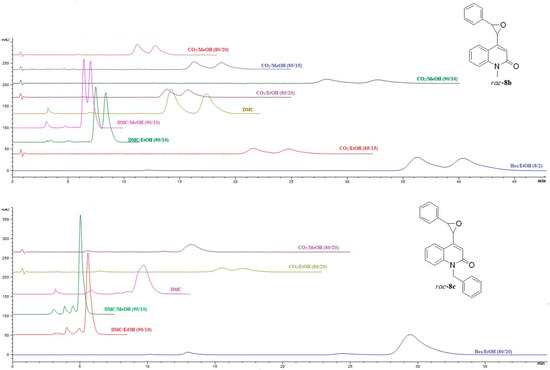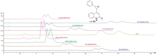 Comparing the results of the enantioselective analysis, it was observed that the enantiomers of compound rac-8b with a methyl group attached to the internal amide bond of quinoline-2(1H)-one showed the best chiral recognition with chiral selector tris-(3,5-dichlorophenylcarbamoyl)cellulose, both in HPLC and SFC mode. In the HPLC mode, the enantiomers of compound rac-8b are retained the longest with the best enantioselectivity, while the longest retention time in the SFC mode was observed for the enantiomers of compound rac-8c with the lower enantioselectivity. Comparing the results of both modes, it was observed that compound rac-8b showed the best enantioseparation results (α = 1.28, Rs = 1.85) with dimethyl carbonate as the mobile phase.