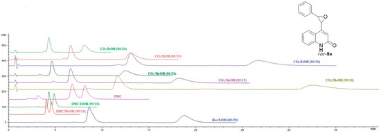 Better chiral recognition of compounds rac-8a and rac-8b with the chiral selector tris-(3,5-dichlorophenylcarbamoyl)cellulose was not achieved by the use of SFC, regardless of the type and volume of alcohol modifier in the CO2 binary system. According to the results obtained, it was observed that the best enantioselectivity was shown by compound rac-8b having a methyl group attached to the internal amide bond of quinoline-2(1H)-one moiety. By comparing the retention factors of the first-emerging enantiomers of compounds rac-8a–c on the selected cellulose-based chiral stationary phase, the longest retention for enantiomers of rac-8c having a benzyl group attached to the internal amide bond within the quinoline-2(1H)-one structure was observed. By examining the effect of the addition of an alcohol modifier in the CO2 mobile phase, it was found that compounds rac-8a-b showed better enantioselectivity by the addition of ethanol compared to more polar methanol. Reducing the volume fraction of ethanol in the CO2 binary system leads to lower enantioselectivity for rac-8a-b. It was also observed that reducing the volume fraction of alcohol in the CO2 binary system leads to longer retention times of the analyte, and at the same time to higher values of the resolution factor Rs [28]. Enantioseparation of rac-8c with CO2/EtOH (85/15, v/v) showed slightly better enantioselectivity with a resolution factor Rs = 1.20 and a retention factor k1 = 25.26 of the first enantiomer, relative to CO2/EtOH (80/20, v/v) as the mobile phase. It is interesting to note that with CO2/MeOH (80/20, v/v) there is a complete lack of enantioseparation. A change in the polarity and volume of alcohol is sufficient to change the geometry and/or size of chiral cavities, which may affect the chiral recognition mechanism [26,43,44,45]. Polar alcohols will form stronger hydrogen bonds with the chiral stationary phase, due to the fact that they can diffuse more easily into a well-defined chiral cavity of the stationary phase [33]. Therefore, less stable complexes will be formed, which will then lead to lower Rs and α. Consistent with the results obtained in the HPLC mode, it was observed that the enantiomers of the analyte were retained shorter with methanol in the CO2 binary system than with ethanol.