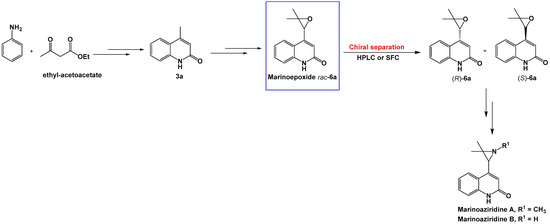 The total synthesis of these compounds is not known yet, nor their absolute configurations. After evaluating several potential strategies, we developed a retrosynthetic analysis of marinoaziridines A and B. As shown in Scheme 1, our proposed synthetic pathway involves the preparation and enantioseparation of an epoxy synthetic intermediate, which we accordingly named marinoepoxide rac-6a. We envisaged access to marinoaziridines A and B via Staudinger reduction of the azido alcohol generated by ring opening of the marinoepoxide rac-6a [5,6].