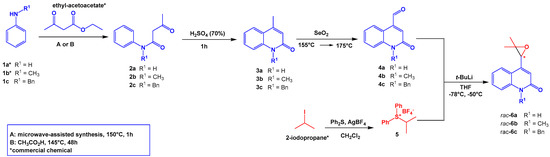Trisubstituted quinoline-2(1H)-one epoxides rac-6a–c were prepared through the convergent synthetic route using isopropyl(diphenyl)sulfonium tetrafluoroborate 5 as a source of sulfur ylide, and the corresponding aldehydes 4a–c (Scheme 2) as the key synthetic step. Commercially available aniline, N-methylaniline and ethyl-acetoacetate were adopted as the starting materials, aldehydes 4a–c were obtained via condensation and cyclization process at Knorr condition, and Riley oxidation was obtained in good yield over three steps. The other fragment, achiral sulfonium salt 5, was prepared from the commercially available benzyl chloride and dimethyl sulfide in the presence of the AgBF4 as a promoter in good yield.
