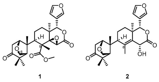 Thaixylomolin A (1), isolated from the seeds of a Thai mangrove Xylocarpus moluccensis collected at the Trang province, was obtained similar to the cleavage of C-6/C-7 by Baeyer–Villiger (BV) oxidation [], and then the oxidized C-6 formed an unusual 6-oxabicyclo[3.2.1]octan-3-one motif with C-1 []. In 2016, the same research group isolated another analogue from X. moluccensis, thaixylomolin R (2) [], whose C-8 is decarboxylated compared with 1 (Figure 1).