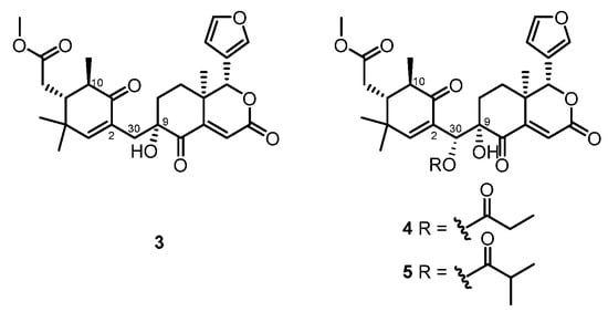 Xylomexicanin F (3) [], hainangrantums I and J (4 and 5) [] (Figure 2) are the second examples of a limonoid with an unusual 9, 10-seco and C-9-C-30 linkage, isolated from the seeds of the Chinese mangrove X. granatum. Among them, 3 showed moderate activity against the A549 and RERF cell lines with IC50 values of 18.83 μM and 15.83 μM, respectively. However, the first reported analogue, xylogranatin D, was concluded as an artifact [,].