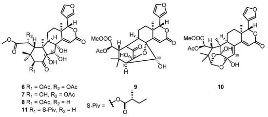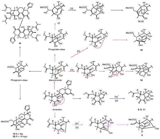 Chemical investigation of the seeds from a Trang (Thailand) mangrove X. moluccensis yielded five structurally intriguing limonoids, namely, trangmolins A–E (6–10) [] (Figure 3). Notably, compounds 6–8 consist of unprecedented ring A/B-fused bicyclic moieties, and compound 10 represents the first example of the oxidative cleavage of the C2-C3 bond among limonoids. In 2021, a trangmolin A derivative krishnolide J (11) was isolated from seeds of the India Krishna mangrove X. moluccensis []. The biosynthetic origins of 6–11 could be traced back to a proposed andirobin-type limonoid with 1,2-bisketone groups []. Taking andirobin as the starting point, scientists from the Wu group proposed a biosynthetic pathway characterized by a highly divergent biosynthetic assembly line (Scheme 1) []. The three forks of the biosynthetic pathway obtain C-1/C-30 linkage (6–8, 11), C-3/C-30 linkage (9), and C-2/C-30 linkage (10) based on the main mechanisms of electro- and nucleophilic enzymatic cascade reactions. The diverse cyclization patterns of 6–11 reveal the remarkable structural plasticity of rings A and B in limonoid biosynthesis.