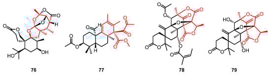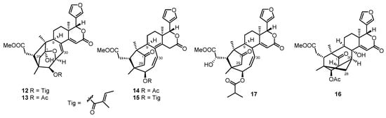 Limonoids are natural tetranortriterpenoids containing a four-ring structure with a 17β-furyl ring mainly distributed in the Meliaceae and Rutaceae families []. In the mangrove flora, they are especially abundant and structurally diversified in the genus Xylocarpus moluccensis and X. grantum (family Meliaceae). Up to 2021, approximately 2700 limonoids have been identified. Moreover, owing to their widespread distribution and substantial content in Meliaceae plants, and active biosynthetic pathways, more than 1600, including 30 types of unique rearrangement skeletons, have been isolated and identified in the last 10 years []. Among them, nearly 233 new limonoids with 14 kinds of novel skeletons were isolated from mangrove Xylocarpus.