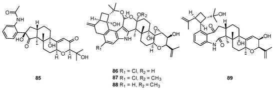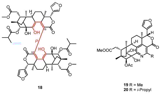 Two unprecedented limonoids, thaixylomolins B and C (19 and 20) (Figure 5), co-isolates with 1 [], are limonoids containing a unique pentasubstituted pyridine scaffold that might be generated by aromatization into a pyridine ring from a phargmalin-class limonoid. (Scheme 1) Thaixylomolin B (19) exhibited inhibitory activity against nitric oxide production in lipopolysaccharide and IFN-γ-induced RAW264.7 murine macrophages with an IC50 value of 84.3 μM.