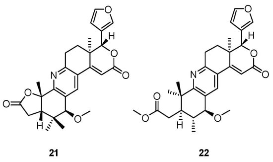 Two pyridine-containing limonoids, xylogranatopyridines A (21) and B (22) (Figure 6), were isolated from the twigs and leaves of X. granatum, collected from the seashore of Dongzhai, Hainan Province []. Compared to 21, xylogranatopyridine B (22) possesses an unprecedented rearranged A-ring. Prexylogranatopyridine, a co-occurrence of limonoid with an unusual C-8-C-30 linkage, could be the common biosynthetic precursor of 21 and 22 (Scheme 2). Xylogranatopyridine A (21) exhibited significant inhibitory activity against protein tyrosine phosphatase 1B (PTP1B) with an IC50 value of 22.9 μM.