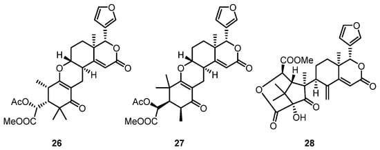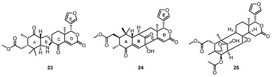 Further investigation of the seeds from the X. granatum led to the isolation of two new tetranortriterpenoids, xylomexicanins I and J (24 and 25) [] (Figure 7). Notably, 24 represents an unprecedented limonoid with a bridged skeleton between the B- and C-rings, contrasting with analogues possessing bridged A- and B-rings (25). Wu et al. proposed that 24 was obtained from the same natural precursor as 22 after an enolate addition to the allylic alcohol moiety between C-3 and C-11 (Scheme 2).