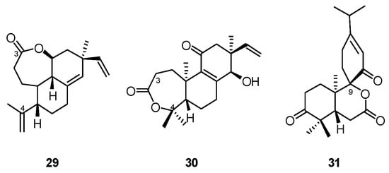 Two new ent-isopimarane-type diterpenoids agallochaexcoerins D and E (29 and 30) [] (Figure 9), possessing an unusual seven-membered lactone moiety, were isolated from the wood of mangrove Excoecaria agallocha. Notably, 29 is the first report of ent-3,4-secoisopimaratriene diterpenoid with a rare seven-membered ring.