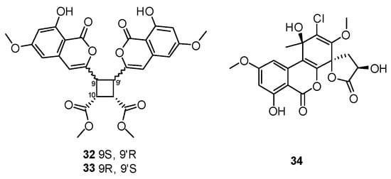 Up to now, 12 new coumarin and 102 new isocoumarin derivatives have been obtained from mangrove-associated fungi [,]. Among them, Peniisocoumarin A and B (32 and 33, Figure 10), a pair of unusual dimeric isocoumarin-type diastereoisomers containing a symmetric four-membered core at C-9/9′ and C-10/10′ were obtained from the fermentation of Penicillium commune QQF-3 (isolated from fresh fruit of the mangrove plant Kandelia candel) []. The structures of 32 and 33 were unanimously defined by X-ray diffraction analysis using Cu Kα radiation. In 2015, Darsih et al., discovered penicilliumolide A (34) (Figure 10), an unusual tetracyclic isocoumarin containing a γ-lactone ring fused with a unique spiro framework, from the mangrove endophytic fungus Penicillium chermesinum HLit-ROR2 [].