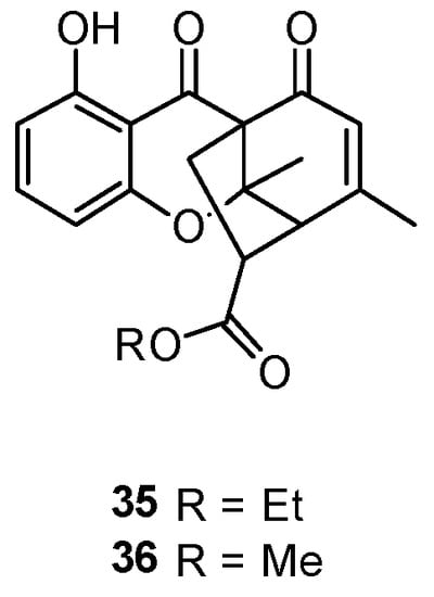 In 2019, two new polycyclic chromones, penixanthones C (35) and D (36) (Figure 11), possessing an unprecedented 6/6/6/5 polycyclic skeleton with a signature C2 bridge, were isolated from the mangrove sediment-derived fungus Penicillium sp. SCSIO041218 []. However, 35 and 36 only showed weak cytotoxicity. Furthermore, the configurations of 35 and 36 remain elusive.