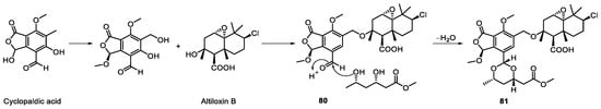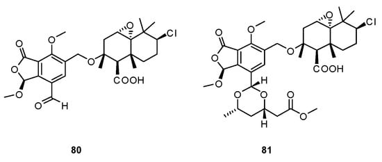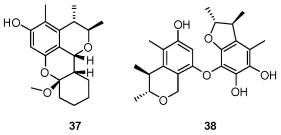 Two new citrinin derivatives, penicitol A (37) and penicitol B (38) (Figure 12) were identified from Penicillium chrysogenum ML226 obtained from the rhizosphere soil of the mangrove plant Acanthus ilicifolius []. The citrinin derivatives are a family of azaphilones, with the first one, namely citrinin, isolated from a P. citrinum strain in 1931 []. Penicitol A (37) is the first reported citrinin derivative with an unusual tetracyclic skeleton, and 38 is the first citrinin dimer with a single oxygen bridging center. 37 and 38 exhibited potent cytotoxic activities against HeLa, BEL-7402, HEK-293, HCT-116, and A-549 cell lines with IC50 values of 4.6–10.5 and 3.4–9.6 μM, respectively. In 2011, Hosokawa et al. reported the first total synthesis of penicitol A (37), achieved by acetalization [].