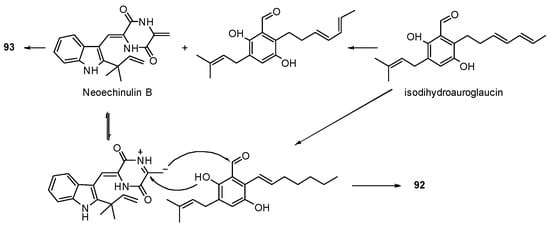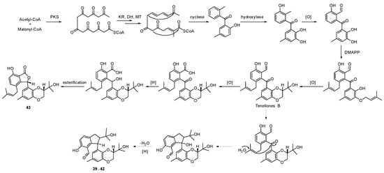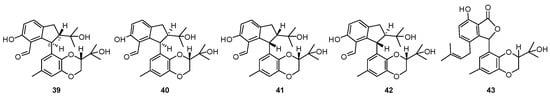 Four unusual 2,3-dihydro-1H-indene isomers, diaporindenes A–D (39–42) (Figure 13), and an unusual isoprenylisobenzofuran A (43) were isolated from Diaporthe sp. SYSU-HQ3, a fungus obtained from the branches of the mangrove plant Excoecaria agallocha collected from Zhuhai in Guangdong province, China []. Compounds 39–42 feature a 2,3-dihydro-1H-indene ring and a 1,4-benzodioxan moiety. Isoprenylisobenzofuran A (43) represented the first example of an isoprenylisobenzofuran nucleus possessing a rare 1,4-benzodioxan moiety. Biosynthetically, compounds 39–43 could be derived from co-occurrence benzophenone type metabolites such as tenellone B, which is formed by acetyl-CoA and malonyl-CoA through the catalysis of PKSs [] (Scheme 5). In a bioassay, compounds 39–43 were found to exhibit significant inhibitory effects against nitric oxide production with IC50 values from 4.2–9.0 μM and selective index (SI) values from 3.5 to 6.9.