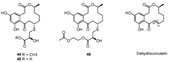 Structures of compounds 44–46 and dehydrocurvularin.