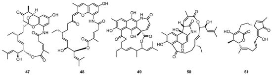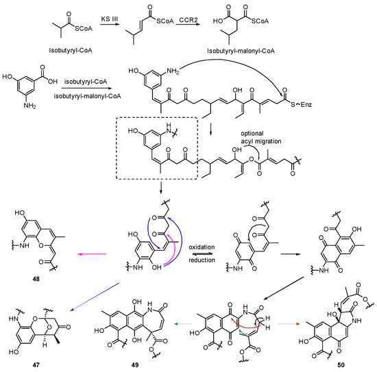 Ansamycins are characterized by an aromatic nucleus connected with a polyketide chain back to a nonadjacent position through an amide bond. Hertweck et al. isolated four unusual ansa macrolides, compounds 47–50 (Figure 15), from Streptomyces sp. HKI0576, a bacterial endophyte separated from the stem of mangrove Bruguiera gymnorrhiza []. This was the first report on discovering ansamycins from a plant endophyte. In addition, the degree of “in-built diversification” of these four compounds is unprecedented for complex polyketides. Among them, divergolide A (47) represents an unusual type of ansa macrolide with an unusual branched side chain and a disrupted polyketide backbone. Furthermore, the tricyclic chromophore is unprecedented for macrolides, and related O-heterocyclic substructures are only known from aromatic polyketides, such as the nogalamycin aglycone [] and chaetoxanthone []. Divergolide B (48) represents another unusual type of ansa macrolide featuring a novel benzopyran/chromene core as the first congener of 47. In addition, compounds 49 and 50 share substructures with 47 and 48 but feature structurally intriguing tetracyclic scaffolds. Furthermore, the ansa macrolides display significant antimicrobial and cytotoxic activities, probably regulating the immunity of the mangrove tree. Compounds 47–50 are biosynthesized from a common linear polyketide using 3-amino-5-hydroxybenzoic acid (AHBA) as a primer unit. Various reactions, including an optional acyl migration, generate the diverse multicyclic structures [,] (Scheme 6).