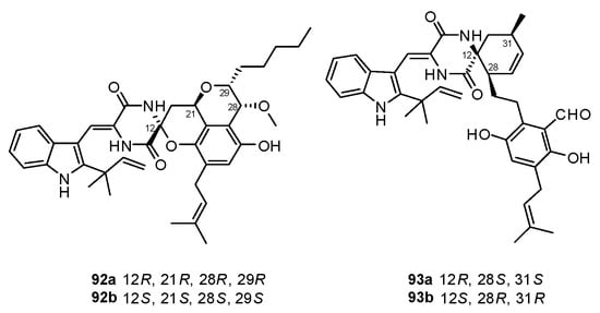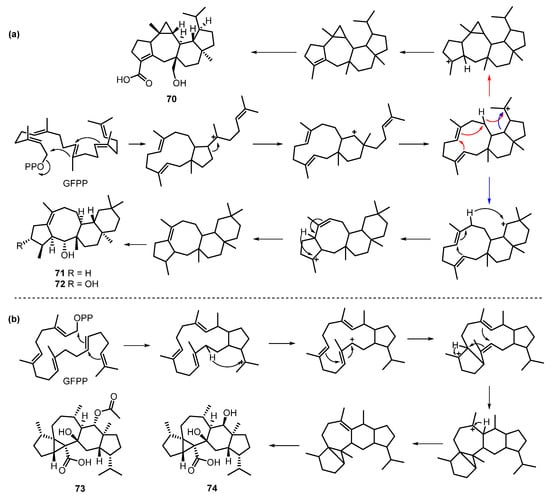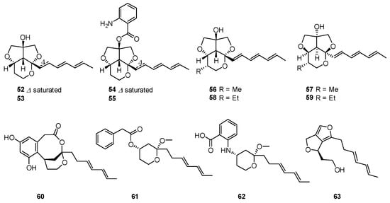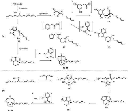 (a) Proposed biosynthetic pathway for compounds 52–55 and 60–63 in the literature []; (b) proposed biosynthetic pathway for 52–55 in this review.
