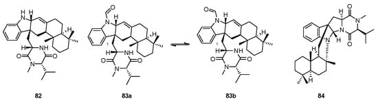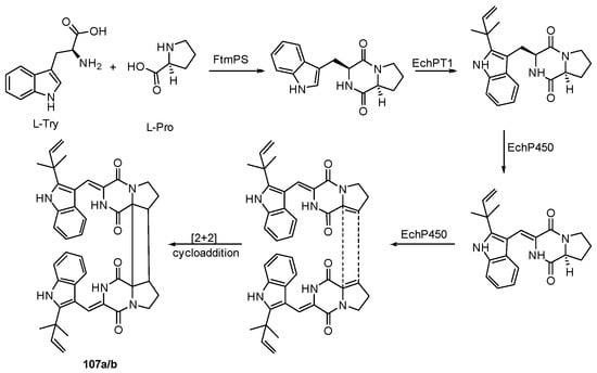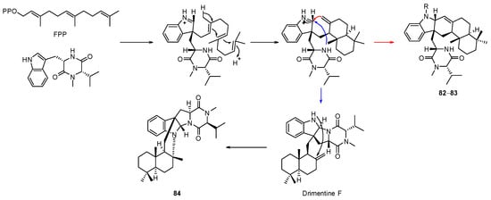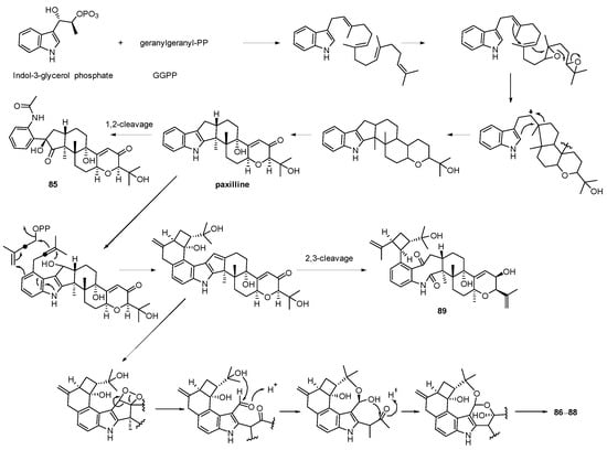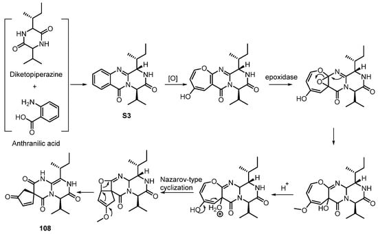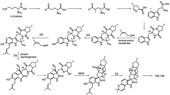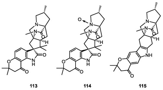 - Byrne, K.M.; Smith, S.K.; Ondeyka, J.G. Biosynthesis of Nodulisporic Acid A: Precursor Studies. J. Am. Chem. Soc. 2002, 124, 7055–7060. [Google Scholar] [CrossRef]