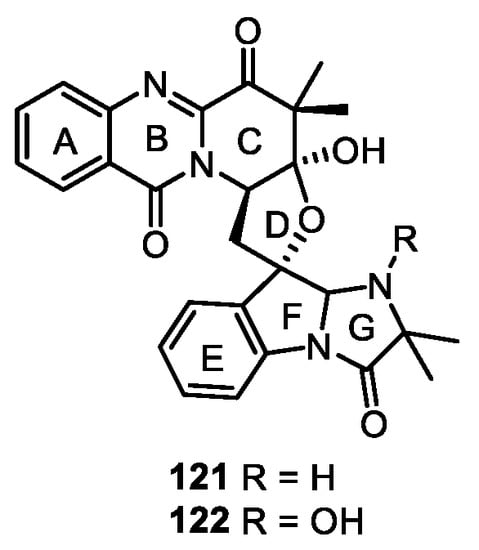 - Yu, G.; Zhou, G.; Zhu, M.; Wang, W.; Zhu, T.; Gu, Q.; Li, D. Neosartoryadins A and B, Fumiquinazoline Alkaloids from a Mangrove-Derived Fungus Neosartorya udagawae HDN13-313. Org. Lett. 2016, 18, 244–247. [Google Scholar] [CrossRef]
