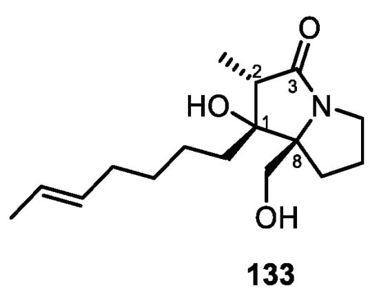 - Zhou, Z.-F.; Kurtán, T.; Yang, X.-H.; Mándi, A.; Geng, M.-Y.; Ye, B.-P.; Taglialatela-Scafati, O.; Guo, Y.-W. Penibruguieramine A, a novel pyrrolizidine alkaloid from the endophytic fungus Penicillium sp. GD6 associated with Chinese mangrove Bruguiera gymnorrhiza. Org. Lett. 2014, 16, 1390–1393. [Google Scholar] [CrossRef]