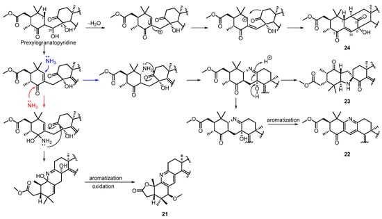 An unusual tetranortriterpenoid, xylomexicanins E (23) (Figure 7), which is the first example of limonoid with azaspiro skeleton between B (pyrrolidine) and C rings, was isolated from the seeds of the Chinese mangrove, X. granatum []. The plausible biosynthetic routes are proposed, as shown in Scheme 2, starting from the limonoid prexylogranatopyridine.