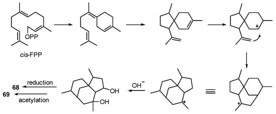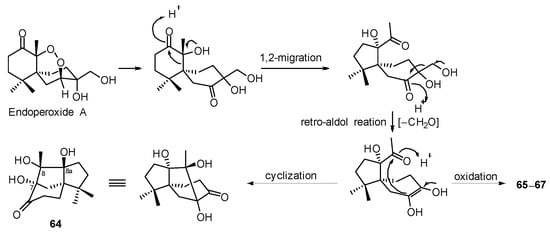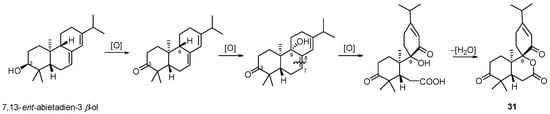Decandrinin (31) (Figure 9), an unprecedented C-9-spiro-fused 7,8-seco-ent-abietane, was obtained from the bark of an Indian mangrove Ceriops decandra (collected in the estuary of Godavari, Andhra Pradesh) []. The biosynthetic precursor might be the naturally more prevalent occurring 7,13-ent-abietadien-3β-ol and the plausible biosynthetic was proposed (Scheme 4). The spiro ring could be formed by oxidative cleavage and lactonization.