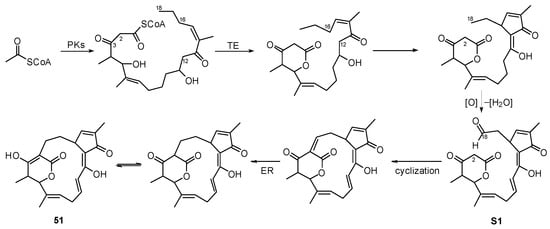 A macrocyclic polyketide with an unusual carbon skeleton, namely hainanmycin A (51) (Figure 15), was isolated from Streptomyces sp. 219807 (from mangrove soil collected in Sanya) []. Compound 51 featured an unprecedented structural skeleton of a 17-membered carbocyclic framework. The cyclo-heptadeca framework containing a cyclopentenone ring substituted with a naturally occurring bridgehead enol motif is unique among NPs. It represents a new subgroup, a minor family of carbocyclic polyketide macrolides. Hong et al. [] proposed a plausible biosynthetic pathway for 51 based on the biosynthesis of akaeolide [], an analogue of 51. Shortly, the PKS condenses acetyl-CoA and other building units (e.g., methylmalonyl-CoA and malonyl-CoA) to a linearized polyketide backbone. A thioesterase (TE) then releases the backbone with the formation of a δ-lactone ring. Further construction of the C-C bonds of C-16/C-12 and C-18/C-2 generate the structural core. Notably, a C-18 aldehyde intermediate (S1) might be involved in the C-18/C-12 carbon bond formation (Scheme 7).