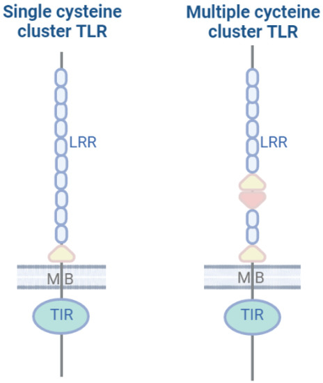 Toll-like receptors (TLRs) are the most ancient class of PRRs, appearing more than 650 million years ago [3]. The TLR structure is represented by homo- and heterodimers that recognize bacterial and viral pathogens, as well as endogenous danger signals. In humans, TLRs are represented by 10 variants, consisting of 700–1100 amino acid residues. TLRs more often function as homodimers, while heterodimers also exist, and the recruitment of other proteins expand the ability of TLRs to recognize ligands. For example, the human TLR4 uses the MD2 and CD14 proteins to recognize LPS, with the LPS structure being critical [4,5]. TLRs consist of an extracellular leucine-rich repeat (LRR) domain for DAMP/PAMP recognition, a transmembrane domain, and a cytoplasmic Toll/IL-1 signal transduction receptor (TIR) domain. Some LRR domains contain cysteine residues in the N-terminal part (LRRNT) or an additional C-terminal (LRRCT) residue, in which case a multiple cysteine cluster is formed. Another nomenclature is also used, which is as follows: (1) the V-type for the single cysteine cluster has only one LRRCT located near to the TIR domain; (2) the P type for the multiple cysteine cluster has more than one LRRCT, and sometimes the LRRNT domain. The proteins that lack the LRR or TIR domain are not classified as TLR receptors and are considered as TLR-like proteins (Figure 1).