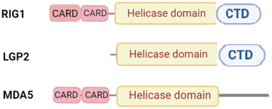 RIG-I-like receptor (retinoic acid-inducible gene-I-like receptors, RLRs) family: retinoic-acid inducible gene 1 (RIG-I), laboratory of genetics and physiology 2 (LGP2); melanoma differentiation-associated 5 (MDA5). All RLRs have a central helicase domain. C-terminal domain (CTD) and the caspase activation and recruitment domain (CARD) may be also present.