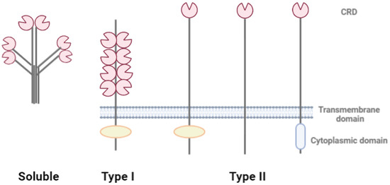 C-type lectin receptors (CLRs). Soluble CLRs have several carbohydrate recognition domains (CRDs) and have no transmembrane domain. Type I CLRs include several CRD or CRD-like domains, transmembrane and cytoplasmic domains. Type II CLRs have one CRD, transmembrane and different cytoplasmic domains.