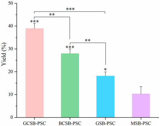 The yield of GCSB-PSC, BCSB-PSC, GSB-PSC, and MSB-PSC is based on dry-weight swim bladders. Significance is indicated by * (*, **, and *** indicate p ≤ 0.01, 0.001, and 0.0001, respectively).
