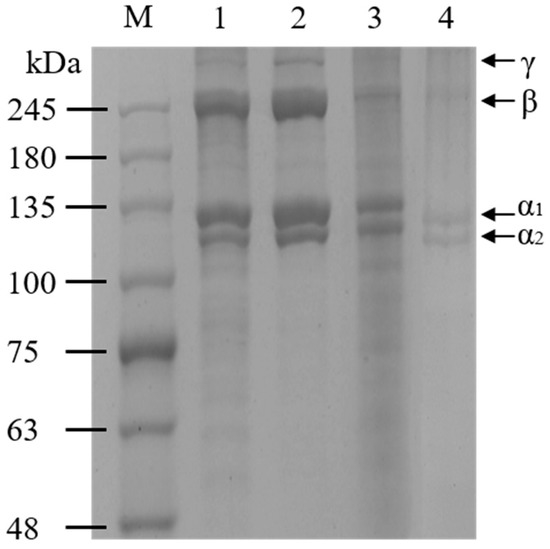 SDS-PAGE patterns of PSC from four species’ swim bladders. M: molecular weight markers; 1: GCSB-PSC; 2: BCSB-PSC; 3: GSB-PSC; 4: MSB-PSC.