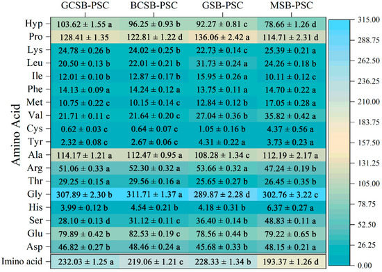 Heatmap of the amino acid composition of GCSB-PSC, BCSB-PSC, GSB-PSC, and MSB-PSC (residues/1000 total amino acid residues). The gradual change of the color scale value from green-yellow-blue indicates the gradual increase in amino acid residues. Different letters denote the significant difference (p < 0.05).
