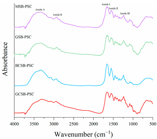 FTIR spectra of GCSB-PSC, BCSB-PSC, GSB-PSC, and MSB-PSC.