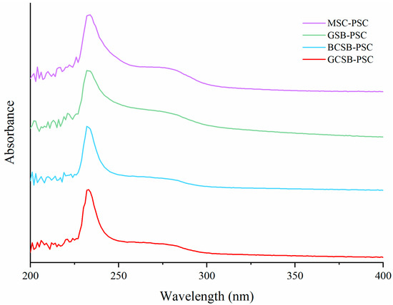 UV spectra of GCSB-PSC, BCSB-PSC, GSB-PSC, and MSB-PSC.