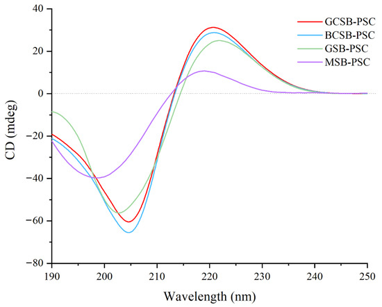 CD spectra of GCSB-PSC, BCSB-PSC, GSB-PSC, and MSB-PSC.