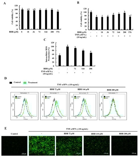 Cytoprotective effect of BDB in TNF-α/IFN-γ-stimulated HaCaT keratinocytes. (A) Dose-response cytotoxicity, (B) Cell viability, and (C) Fluorometric intracellular ROS generation. Further analysis of ROS level by (D) flow cytometry and (E) fluorescence microscopy, with and without TNF-α/IFN-γ stimulation. Cells were treated with DCF-DA for intracellular ROS assays. The values are presented as the mean ± standard error (SE) and represent data from three different experiments (n = 3). Different letters produce significantly different error bars (p ˂ 0.05).