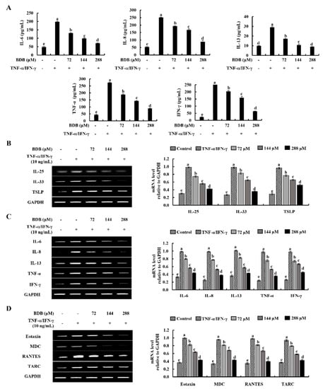 Inhibitory effects of BDB on inflammatory cytokines and chemokines productions in TNF-α/IFN-γ-stimulated HaCaT keratinocytes. (A) Analysis of cytokine production in TNF-α/IFN-γ-stimulated HaCaT keratinocytes using ELISA kits. Effect of BDB on mRNA expression of (B) epithelial and epidermal innate cytokines, (C) inflammatory cytokines, and (D) chemokines. Data are represented as mean ± SE of three independent determinations (n = 3). Error bars for each molecule with different letters are notably different (p < 0.05).