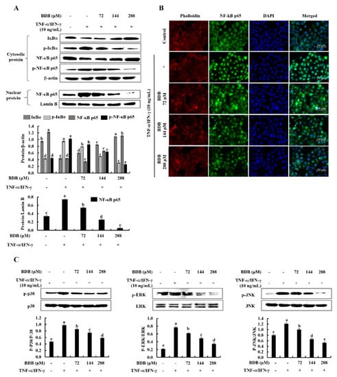 Inhibitory effects of BDB on NF-κB and MAPK molecular mediators in TNF-α/IFN-γ-stimulated HaCaT keratinocytes. (A) Western blot analysis of NF-κB, (B) Immunofluorescence analysis of NF-κB p65 nuclear translocation, and (C) western blot analysis of MAPK protein expression in TNF-α/IFN-γ-stimulated HaCaT keratinocytes affected by BDB treatment. All experiments were carried out in triplicate (n = 3), and the results are shown as means ± SE. Error bars with different letters show a significant difference (p ˂ 0.05) for each molecular mediator.