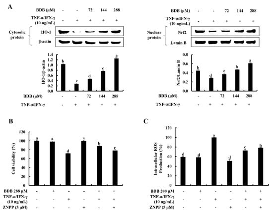 The protective effect of BDB on cytosolic HO-1 and nuclear-translocated Nrf2 was examined using western blot analysis. As Figure 4A indicates, TNF-α/IFN-γ stimulation reduced cytosolic HO-1 and nuclear-translocated Nrf2 relative to the control group, while these were considerably elevated with the BDB treatment in a dose-dependent manner in HaCaT keratinocytes. In addition, the cytoprotective effect of BDB was investigated in terms of cell viability and intracellular ROS production in TNF-α/IFN-γ-stimulated HaCaT keratinocytes with the presence of zinc protoporphyrin IX (ZnPP), an HO-1 inhibitor, by downregulating HO-1 activity [14,15]. TNF-α/IFN-γ stimulation reduced cell viability while increasing ROS production, whereas the BDB treatment significantly enhanced cell viability and lowered ROS production in a dose-dependent manner. However, ZnPP considerably eliminated the cell viability increment, whereas it increased ROS production, which was decreased by the BDB treatment (Figure 4B,C).