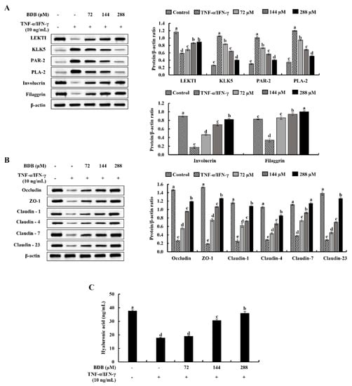 Protective effect of BDB on skin barrier function in TNF-α/IFN-γ-stimulated HaCaT keratinocytes. Western blot analysis of (A) skin moisturization controlling key proteins, (B) tight junction proteins expression, and (C) ELISA of HA synthesis. The repeatability of results was ensured with three independent determinations (n = 3, mean ± SE). Error bars with different letters differ significantly (p ˂ 0.05).