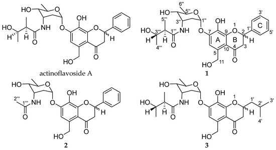 Structures of actinoflavosides A and B–D (1–3).
