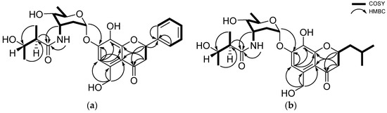 (a) Key 1H-1H COSY and HMBC correlations of actinoflavoside B (1); (b) Key correlations of actinoflavoside D (3).
