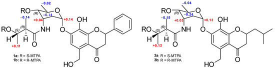 ΔδS-R values (ppm) obtained for the S- and R-MTPA esters (1a, 1b and 3a, 3b).