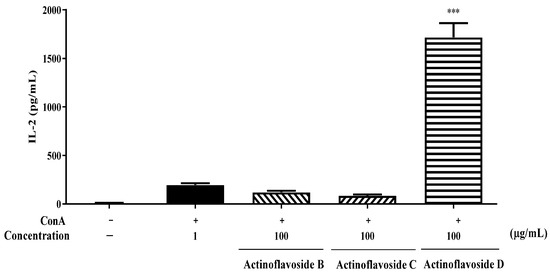 Effects of actinoflavosides on IL-2 production in splenocytes. Splenocytes were treated with actinoflavosides B, C, or D (100 µg/mL) in the presence of ConA for 72 h. IL-2 cytokine in the cell supernatant was measured by ELISA kit. The absorbance was read with an ELISA microplate reader at 450 nm. Data were expressed as mean ± SEM. *** p < 0.001 compared with the ConA treated group.