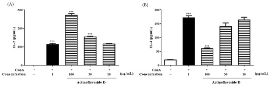 Effects of actinoflavoside D on IL-2 and IL-4 production in splenocytes. Splenocytes were treated with actinoflavoside D (10, 30, or 100 µg/mL) in the presence of ConA for 72 h. (A) IL-2 and (B) IL-4 cytokines in the cell supernatant were measured by ELISA kits. The absorbance was read at 450 nm using an ELISA microplate reader. Data were expressed as mean ± SEM. +++ p < 0.001 compared with the non-treated group. *** p < 0.001 compared with the ConA treated group.