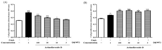 In our endeavor to find new bioactive natural products, among a wide range of untargeted bioactivity tests, actinoflavosides B–D (1–3) showed antibacterial activities and immunomodulatory activity. First, actinoflavosides B–D were measured for growth inhibition activity against pathogenic bacteria, Bacillus subtilis ATCC 6051, Pseudomonas aeruginosa KCTC 22073, Escherichia coli ATCC 11775, and Erwinia rhapontici ATCC 29283. Actinoflavoside B and D inhibited the growth of P. aeruginosa with minimum inhibitory concentration (MIC) values of 0.29 and 0.30 mM, respectively. Actinoflavoside B showed antibacterial activity against B. subtilis with a MIC value of 0.14 mM. Additionally, to study the immunomodulatory activities of actinoflavosides B–D, interleukin-2 (IL-2) cytokine levels were measured in splenocytes isolated from mice. IL-2, a cytokine produced by Th1-type cells, is a T cell growth factor essential for T cell proliferation and differentiation [13,14]. Splenocytes were pretreated with actinoflavosides B–D (100 µg/mL) for 1 h and then concanavalin A (ConA; a T cell activator: 1 µg/mL) for 72 h. As shown in Figure 4, actinoflavoside D significantly increased the IL-2 cytokine production from splenocytes with ConA treatment. Next, we tested the effects of actinoflavoside D on the production of interleukin-4 (IL-4), a cytokine produced by Th2-type cells; this cytokine can produce many responses, some of which are associated with allergy and asthma [15]. Splenocytes were treated with actinoflavoside D (10, 30, or 100 µg/mL) and induced with ConA (1 µg/mL) for 72 h. IL-2 and IL-4 cytokines produced in the cell supernatants were detected by sandwich enzyme-linked immunosorbent assay (ELISA). As shown in Figure 5, actinoflavoside D significantly increased the IL-2 cytokine in ConA-induced splenocytes in a dose-dependent manner. By contrast, actinoflavoside D decreased the IL-4 cytokine production in ConA-induced splenocytes. Taken together, these results suggest that actinoflavoside D plays an important role in the T cell immune response by increasing primary T cell activation and IL-2 cytokine production without Th2-type cell activation. We investigated the effects of actinoflavoside D on splenocyte proliferation in the absence or presence of ConA. Splenocytes isolated from BALB/c mice spleens were treated with actinoflavoside D. As a result, the proliferation of splenocytes was significantly increased by actinoflavoside D (3, 10, 30, or 100 μg/mL) without (Figure 6A) or with (Figure 6B) ConA (1 µg/mL).