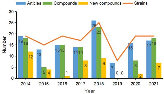 The numbers of articles, compounds, and strains reported by marine-derived Bacillus species from 2014–2021.