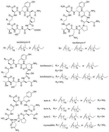 The structures of iturin family members (bacillomycin D, F, L, Lc, iturin A, AL, C and mycosubtilin).