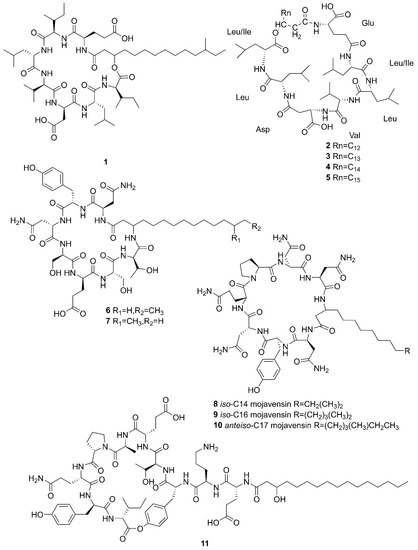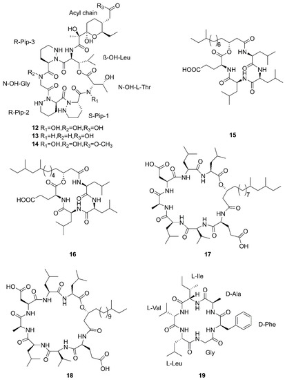 Linear lipopeptide is a kind of lipopeptide, in which amino acids are connected in turn into linear, unconnected head and tail and no cyclic structure. Fatty acids are connected to α-amino groups or other hydroxyl groups at the N-terminal of the peptide chain [56]. Figure 5 lists the structures of linear lipopeptides that were produced by marine-derived Bacillus species.