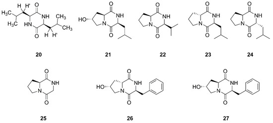 Compound 20 was established as a diketopiperazine (3S, 6S)-3,6-diisobutylpiperazine-2,5-dione, which was isolated from the ethyl acetate extract of the culture broth of Bacillus sp. SPB7. This strain SPB7 was obtained from marine sponge Spongia officinalis collected from the Palk Bay of Bengal, India. In particular, this is the first time that compound 20 had been isolated from a sponge-associated microbe [53]. Finally, seven cyclic dipeptides compounds 21–27 were identified and characterized as cyclo (L-leu-trans-8-hydroxy-L-pro), cyclo (L-val-L-pro), cyclo (D-pro-L-leu), cyclo (L-pro-D-leu), cyclo (gly-L-pro), cyclo (L-phe-cis-8-hydroxy-D-pro), and cyclo (L-phe-trans-8-hydroxy-L-pro), respectively, which were isolated from Bacillus sp. UST050418-715 collected from sponge in the sea near St. Juan Island, Washington, USA [54]. Compound 25 was also found from sponge-endosymbiotic Bacillus species collected from Agatti island located in the Arabian Sea, in the Laksha Archipelago of India [55].